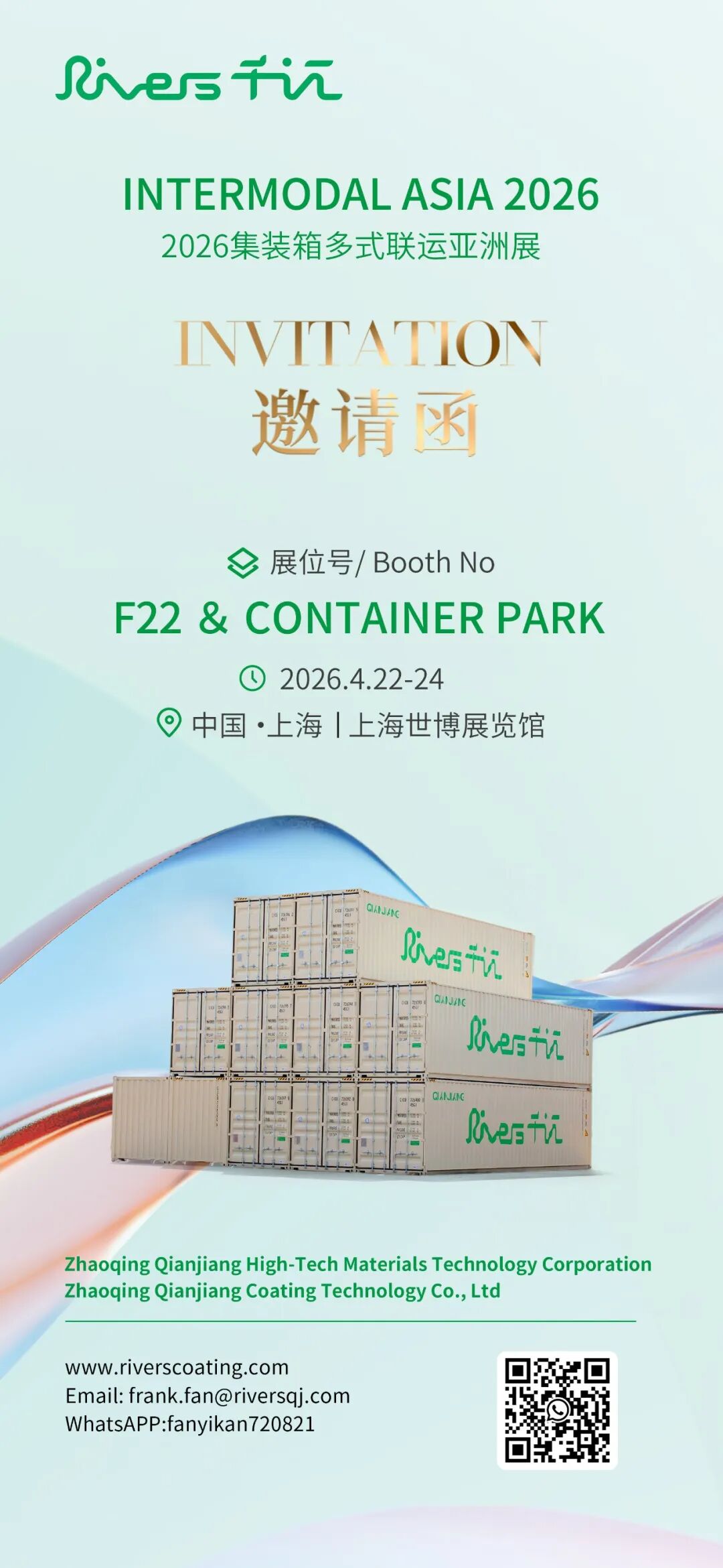 慧正资讯,作为绿色粉末涂料重点企业,Rivers千江将于4月22日至24日亮相2026集装箱多式联运亚洲展,在上海世博展览馆3号馆F22展位及CONTAINER PARK,重磅展出集装箱整箱高品质涂料整体解决方案。 本次展会汇聚全球集装箱与多式联运领域的前沿技术与专业资源,千江诚邀新老客户、业界同仁莅临展位,共话行业趋势、对接技术方案、洽谈深度合作。